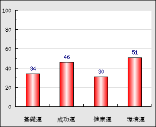 環境運 家庭や職場等での援助運・環境運を司ります。これが良いと配偶者や子供・職場の同僚などから助力が得られやすく、悪いと波乱・不和・孤独などがあります。 51点