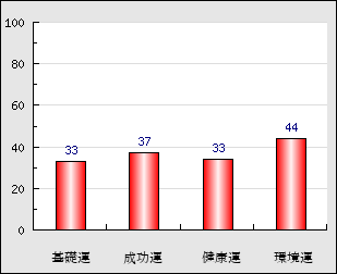 環境運 家庭や職場等での援助運・環境運を司ります。これが良いと配偶者や子供・職場の同僚などから助力が得られやすく、悪いと波乱・不和・孤独などがあります。 44点