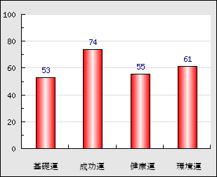 成功運 目的に対する成功運の強さをあらわします。この点数が高いほど自分の思い通りに成功し、逆に悪いと逆境・批判・障害などに苦心します。 74点