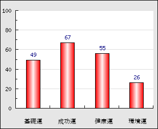 成功運 目的に対する成功運の強さをあらわします。この点数が高いほど自分の思い通りに成功し、逆に悪いと逆境・批判・障害などに苦心します。 67点