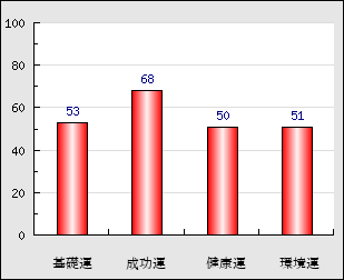 環境運 家庭や職場等での援助運・環境運を司ります。これが良いと配偶者や子供・職場の同僚などから助力が得られやすく、悪いと波乱・不和・孤独などがあります。 51点