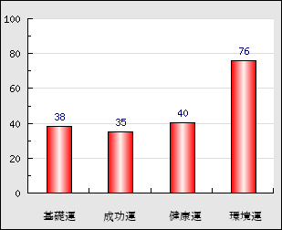 成功運 目的に対する成功運の強さをあらわします。この点数が高いほど自分の思い通りに成功し、逆に悪いと逆境・批判・障害などに苦心します。 35点