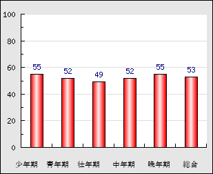 ※年代別運勢グラフは、あくまでも時期別の運勢を概算したものですので参考程度にご覧ください。少年期や青年期の運勢が平均と比べて高い場合は比較的若い頃に成功や幸福があり、反対に中年期や晩年期の運勢が平均と比べて高い場合は後年に華開く大器晩成型と言えるでしょう。ただし、少年期の運勢が低いからと言って、若い頃は成功しないといったことではありません。