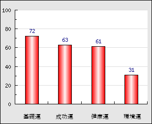 環境運 家庭や職場等での援助運・環境運を司ります。これが良いと配偶者や子供・職場の同僚などから助力が得られやすく、悪いと波乱・不和・孤独などがあります。 31点