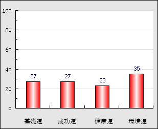 成功運 目的に対する成功運の強さをあらわします。この点数が高いほど自分の思い通りに成功し、逆に悪いと逆境・批判・障害などに苦心します。 27点