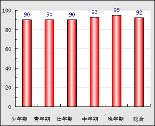 ※年代別運勢グラフは、あくまでも時期別の運勢を概算したものですので参考程度にご覧ください。少年期や青年期の運勢が平均と比べて高い場合は比較的若い頃に成功や幸福があり、反対に中年期や晩年期の運勢が平均と比べて高い場合は後年に華開く大器晩成型と言えるでしょう。ただし、少年期の運勢が低いからと言って、若い頃は成功しないといったことではありません。