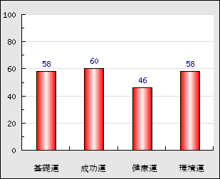 環境運 家庭や職場等での援助運・環境運を司ります。これが良いと配偶者や子供・職場の同僚などから助力が得られやすく、悪いと波乱・不和・孤独などがあります。 58点