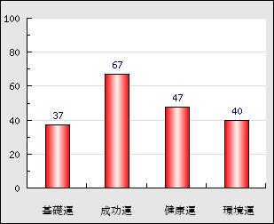 環境運 家庭や職場等での援助運・環境運を司ります。これが良いと配偶者や子供・職場の同僚などから助力が得られやすく、悪いと波乱・不和・孤独などがあります。 40点