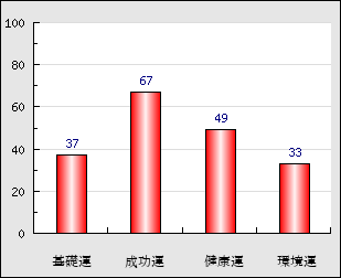 成功運 目的に対する成功運の強さをあらわします。この点数が高いほど自分の思い通りに成功し、逆に悪いと逆境・批判・障害などに苦心します。 67点