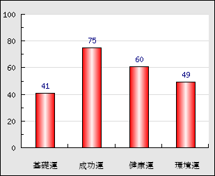 成功運 目的に対する成功運の強さをあらわします。この点数が高いほど自分の思い通りに成功し、逆に悪いと逆境・批判・障害などに苦心します。 75点