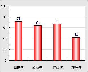 環境運 家庭や職場等での援助運・環境運を司ります。これが良いと配偶者や子供・職場の同僚などから助力が得られやすく、悪いと波乱・不和・孤独などがあります。 42点