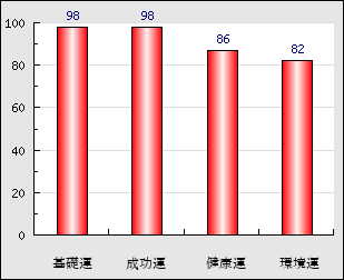 成功運 目的に対する成功運の強さをあらわします。この点数が高いほど自分の思い通りに成功し、逆に悪いと逆境・批判・障害などに苦心します。 98点