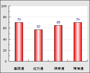 成功運 目的に対する成功運の強さをあらわします。この点数が高いほど自分の思い通りに成功し、逆に悪いと逆境・批判・障害などに苦心します。 57点