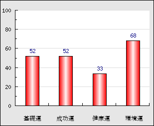 環境運 家庭や職場等での援助運・環境運を司ります。これが良いと配偶者や子供・職場の同僚などから助力が得られやすく、悪いと波乱・不和・孤独などがあります。 68点