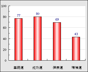 成功運 目的に対する成功運の強さをあらわします。この点数が高いほど自分の思い通りに成功し、逆に悪いと逆境・批判・障害などに苦心します。 80点