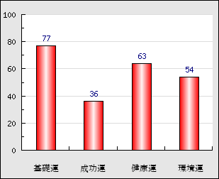 環境運 家庭や職場等での援助運・環境運を司ります。これが良いと配偶者や子供・職場の同僚などから助力が得られやすく、悪いと波乱・不和・孤独などがあります。 54点