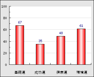 成功運 目的に対する成功運の強さをあらわします。この点数が高いほど自分の思い通りに成功し、逆に悪いと逆境・批判・障害などに苦心します。 35点