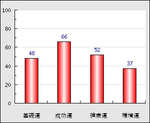 成功運 目的に対する成功運の強さをあらわします。この点数が高いほど自分の思い通りに成功し、逆に悪いと逆境・批判・障害などに苦心します。 66点