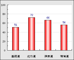 成功運 目的に対する成功運の強さをあらわします。この点数が高いほど自分の思い通りに成功し、逆に悪いと逆境・批判・障害などに苦心します。 72点