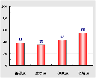 環境運 家庭や職場等での援助運・環境運を司ります。これが良いと配偶者や子供・職場の同僚などから助力が得られやすく、悪いと波乱・不和・孤独などがあります。 55点