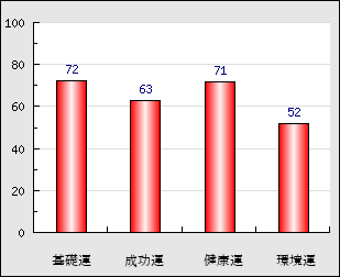 環境運 家庭や職場等での援助運・環境運を司ります。これが良いと配偶者や子供・職場の同僚などから助力が得られやすく、悪いと波乱・不和・孤独などがあります。 52点