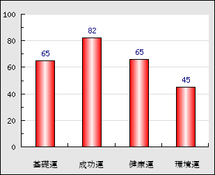 成功運 目的に対する成功運の強さをあらわします。この点数が高いほど自分の思い通りに成功し、逆に悪いと逆境・批判・障害などに苦心します。 82点