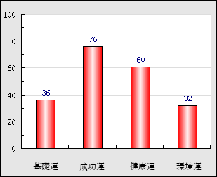 成功運 目的に対する成功運の強さをあらわします。この点数が高いほど自分の思い通りに成功し、逆に悪いと逆境・批判・障害などに苦心します。 76点