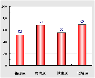 成功運 目的に対する成功運の強さをあらわします。この点数が高いほど自分の思い通りに成功し、逆に悪いと逆境・批判・障害などに苦心します。 68点