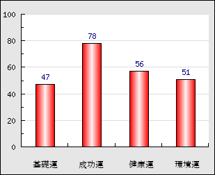 成功運 目的に対する成功運の強さをあらわします。この点数が高いほど自分の思い通りに成功し、逆に悪いと逆境・批判・障害などに苦心します。 78点
