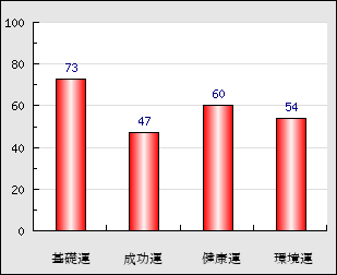 成功運 目的に対する成功運の強さをあらわします。この点数が高いほど自分の思い通りに成功し、逆に悪いと逆境・批判・障害などに苦心します。 47点