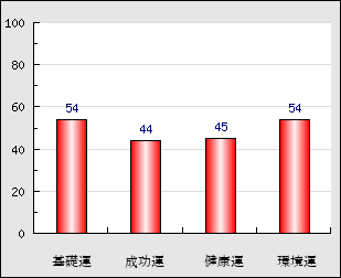 成功運 目的に対する成功運の強さをあらわします。この点数が高いほど自分の思い通りに成功し、逆に悪いと逆境・批判・障害などに苦心します。 44点