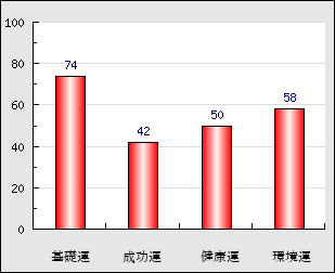 成功運 目的に対する成功運の強さをあらわします。この点数が高いほど自分の思い通りに成功し、逆に悪いと逆境・批判・障害などに苦心します。 42点