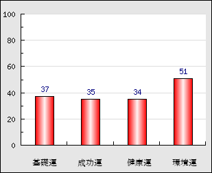 環境運 家庭や職場等での援助運・環境運を司ります。これが良いと配偶者や子供・職場の同僚などから助力が得られやすく、悪いと波乱・不和・孤独などがあります。 51点