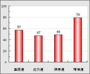 環境運 家庭や職場等での援助運・環境運を司ります。これが良いと配偶者や子供・職場の同僚などから助力が得られやすく、悪いと波乱・不和・孤独などがあります。 79点