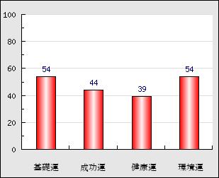 成功運 目的に対する成功運の強さをあらわします。この点数が高いほど自分の思い通りに成功し、逆に悪いと逆境・批判・障害などに苦心します。 44点
