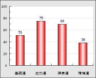 成功運 目的に対する成功運の強さをあらわします。この点数が高いほど自分の思い通りに成功し、逆に悪いと逆境・批判・障害などに苦心します。 75点