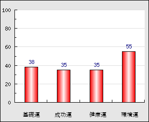 成功運 目的に対する成功運の強さをあらわします。この点数が高いほど自分の思い通りに成功し、逆に悪いと逆境・批判・障害などに苦心します。 35点