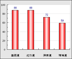 成功運 目的に対する成功運の強さをあらわします。この点数が高いほど自分の思い通りに成功し、逆に悪いと逆境・批判・障害などに苦心します。 88点