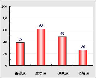 成功運 目的に対する成功運の強さをあらわします。この点数が高いほど自分の思い通りに成功し、逆に悪いと逆境・批判・障害などに苦心します。 62点