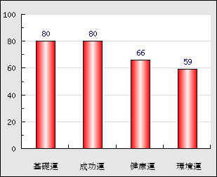 成功運 目的に対する成功運の強さをあらわします。この点数が高いほど自分の思い通りに成功し、逆に悪いと逆境・批判・障害などに苦心します。 80点