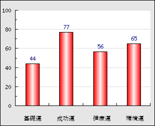 成功運 目的に対する成功運の強さをあらわします。この点数が高いほど自分の思い通りに成功し、逆に悪いと逆境・批判・障害などに苦心します。 77点