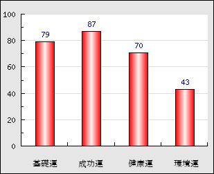 成功運 目的に対する成功運の強さをあらわします。この点数が高いほど自分の思い通りに成功し、逆に悪いと逆境・批判・障害などに苦心します。 87点
