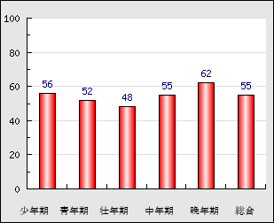 ※年代別運勢グラフは、あくまでも時期別の運勢を概算したものですので参考程度にご覧ください。少年期や青年期の運勢が平均と比べて高い場合は比較的若い頃に成功や幸福があり、反対に中年期や晩年期の運勢が平均と比べて高い場合は後年に華開く大器晩成型と言えるでしょう。ただし、少年期の運勢が低いからと言って、若い頃は成功しないといったことではありません。