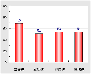 成功運 目的に対する成功運の強さをあらわします。この点数が高いほど自分の思い通りに成功し、逆に悪いと逆境・批判・障害などに苦心します。 51点