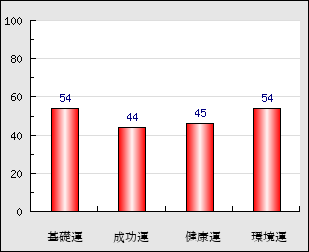 成功運 目的に対する成功運の強さをあらわします。この点数が高いほど自分の思い通りに成功し、逆に悪いと逆境・批判・障害などに苦心します。 44点