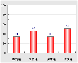 環境運 家庭や職場等での援助運・環境運を司ります。これが良いと配偶者や子供・職場の同僚などから助力が得られやすく、悪いと波乱・不和・孤独などがあります。 51点