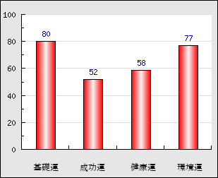 環境運 家庭や職場等での援助運・環境運を司ります。これが良いと配偶者や子供・職場の同僚などから助力が得られやすく、悪いと波乱・不和・孤独などがあります。 77点