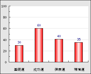 成功運 目的に対する成功運の強さをあらわします。この点数が高いほど自分の思い通りに成功し、逆に悪いと逆境・批判・障害などに苦心します。 60点