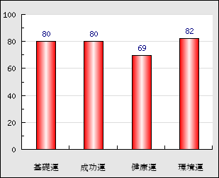 成功運 目的に対する成功運の強さをあらわします。この点数が高いほど自分の思い通りに成功し、逆に悪いと逆境・批判・障害などに苦心します。 80点