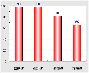 環境運 家庭や職場等での援助運・環境運を司ります。これが良いと配偶者や子供・職場の同僚などから助力が得られやすく、悪いと波乱・不和・孤独などがあります。 66点
